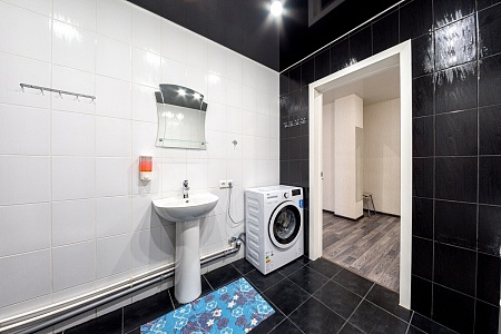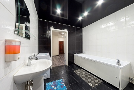 Просторный санузел, оснащенный ванной. В квартире есть вся необходимая бытовая техника и мебель, включая телевизоры в спальне и кухне, стиральную машину, плиту, духовку, микроволновую печь, холодильник.