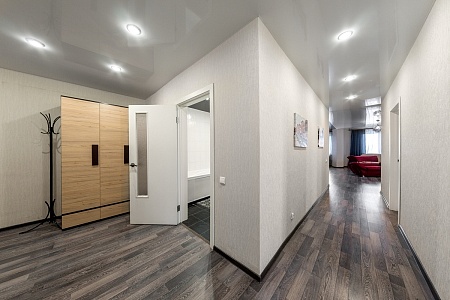 Все комнаты не проходные, с отдельным выходом в коридор. Просторная гостинная (48 м2) объединена с кухонной зоной и две отдельные спальни.