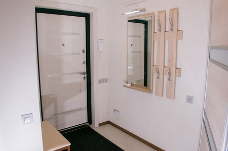Просторный холл квартиры, выполненный в светлых тонах, отличает оригинальная пространственная планировка. Кухонная зона укомплектована всевозможной бытовой техникой, барной стойкой и стульями, набором посуды на 4 персоны.