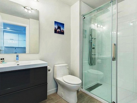 Просторный санузел оборудован современной душевой зоной, отделан гранитом и мозаикой.