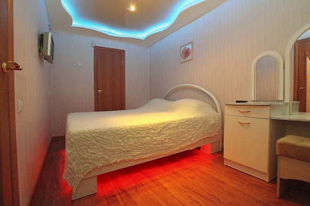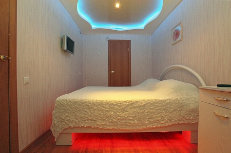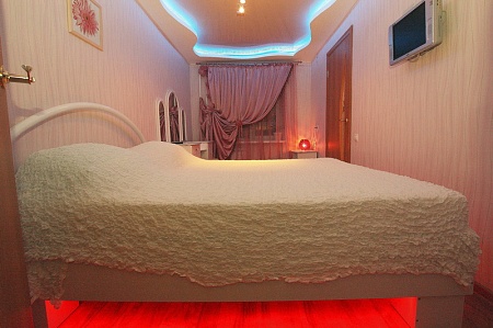 В просторном холле - журнальный столик, кожаный диван и стильные элементы интерьера, а также деловая зона с письменным столом и креслом. В спальной комнате - трильяж и отличная 2-спальная кровать 200х200 с ортопедическим матрацем И ДЕКОРАТИВНОЙ НЕОНОВОЙ ПОДСВЕТКОЙ, создающей особое настроение…