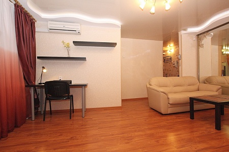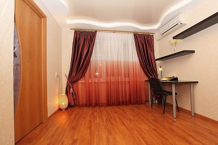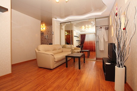Апартаменты состоят из трёх отдельных помещений – кабинета/холла, спальни, столовой и гардеробной. В квартире выполнен евроремонт, смонтировано многоуровневое освещение, натяжные потолки, в отделке стен использована декоративная венецианская штукатурка. Площадь - 45 кв.м.