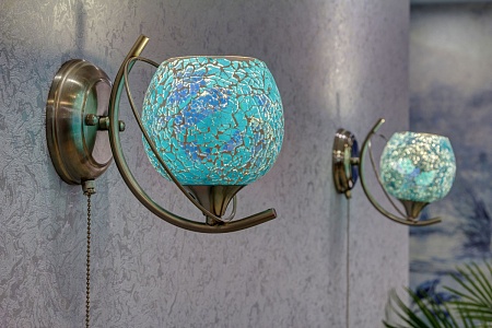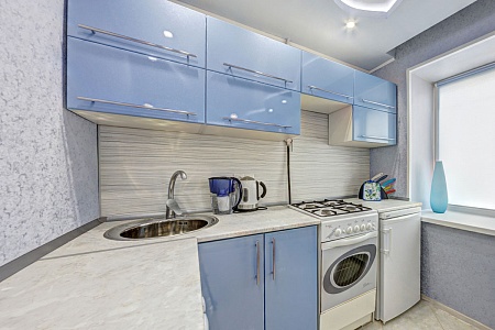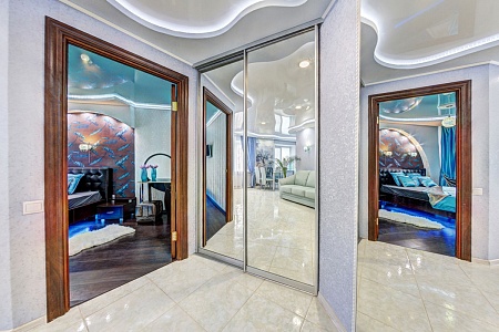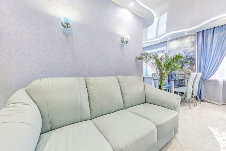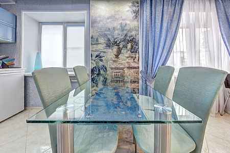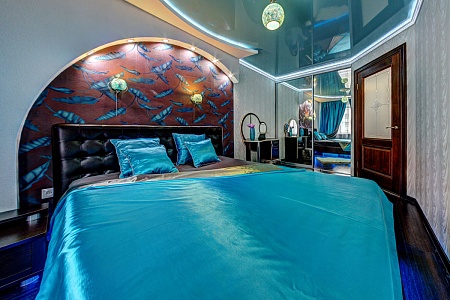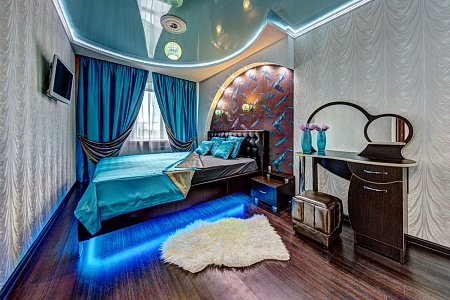 В квартире воплощена авторская планировка пространства, продуманного до мелочей. Зал и кухонная зона объединены в просторный холл, получивший оригинальное цветовое решение в светло-голубых тонах. В свою очередь спальня, отделанная в классическом стиле, радует глаз изысканностью гармонии шоколадного и бирюзового цветов.