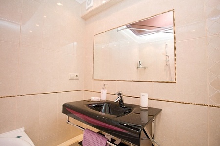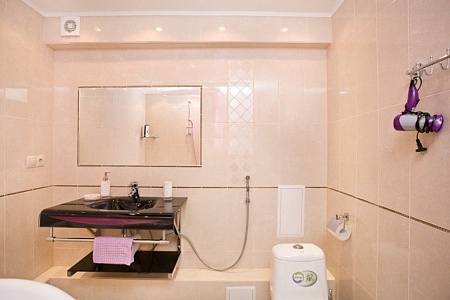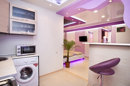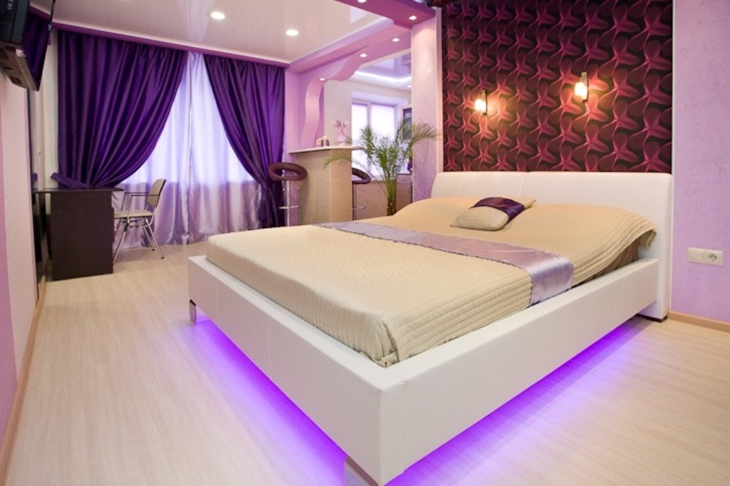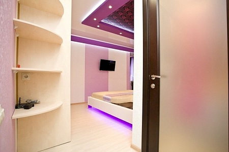 Оригинальный авторский интерьер, декорированный всевозможными оттенками лилового и фиолетового цветов, удобная двуспальная кровать с изумительной LED-подсветкой, кондиционер, двойная гидромассажная ванная (джакузи), барная стойка, система декоративного освещения квартиры, многоуровневые потолки и свободный WiFi - всё это сделает Ваше пребывание в данных апартаментах максимально комфортным и незабываемым!
