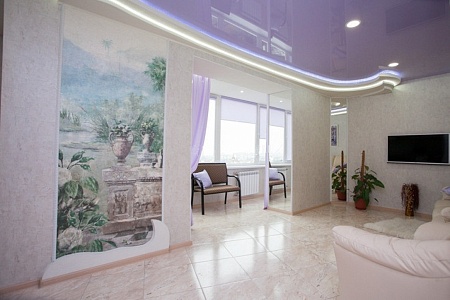 Гостиная оформлена авторскими картинами венецианской тематики из натуральной кожи и декорирована фресками в итальянском стиле.