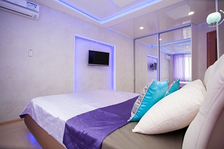 В спальне дизайнерская кожаная кровать с LED-подстветкой.