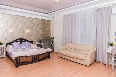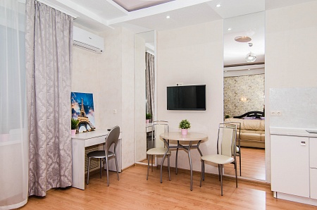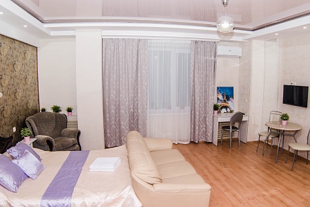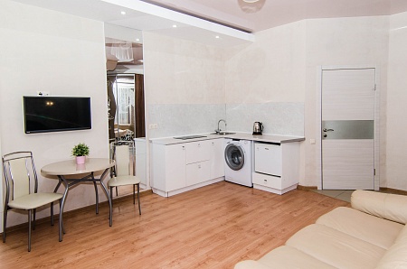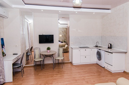 В самой квартире выполнен евроремонт, адаптированный под потребности делового туриста, который может воспользоваться всем спектром удобств и комфорта, необходимых в командировке - от безлимитного WiFi до гидромассажной ванной.