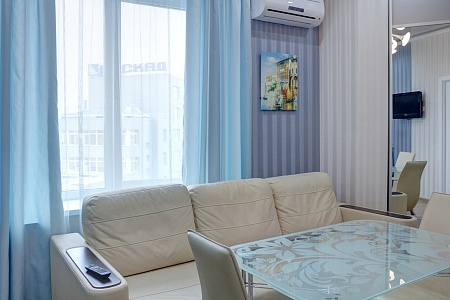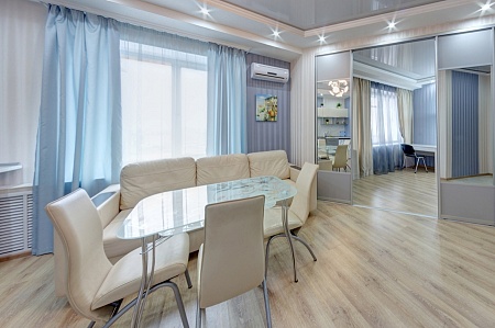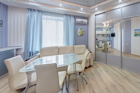 Данные апартаменты расположены в доме бизнес класса центрального района города на пересечении его основных магистралей – проспекта Ленина и улицы Российской, в доме с закрытой территорией, службой консьержа и охраняемым подземным паркингом, оборудованным автомойкой.