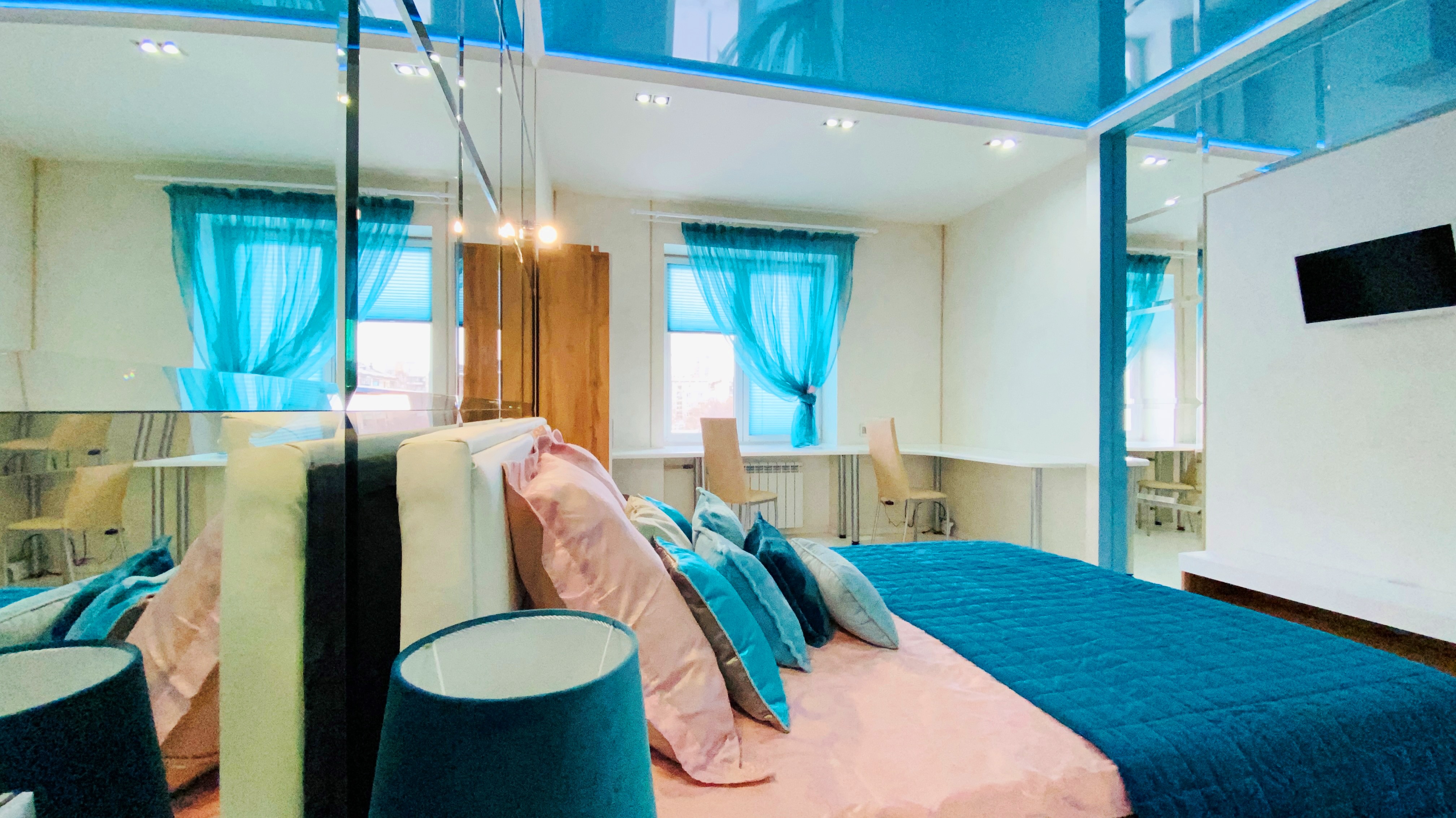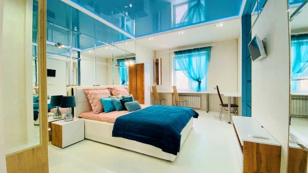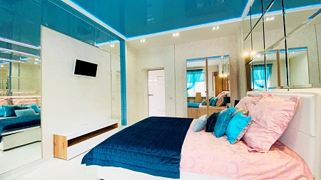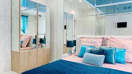 Спальня выполнена в стиле модерн, где воссоздана атмосфера зазеркалья, а наличие многоуровневой системы освещения создает неповторимую игру световых преломлений и отражений. Кровать с ортопедическим основанием 160*200 и качественный матрас стоят на страже вашего сна. При этом в спальне расположен вместительный стол, который может быть использован в качестве рабочего места.