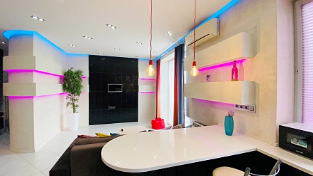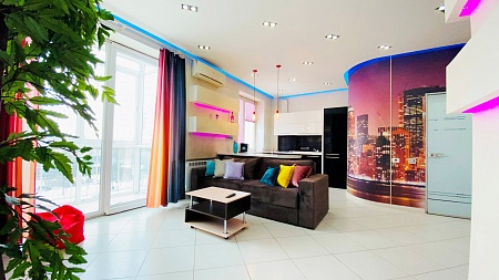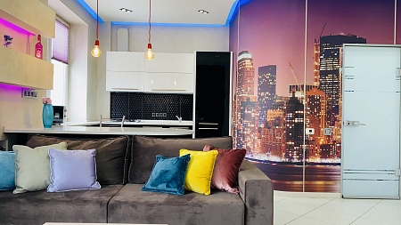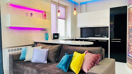 Из остекленной гостиной, объединенной с кухней в единое пространство студии, открывается вид на центр города. Многоуровневая система освещения квартиры, включающая дизайнерский свет, системы "тёплый пол", просторная ванная и оригинальная спальня создают дополнительный уют.